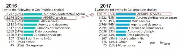 与2016年只要用于编写CLI工具不同,2017年Go的主要用途是编写API/RPC服务。
