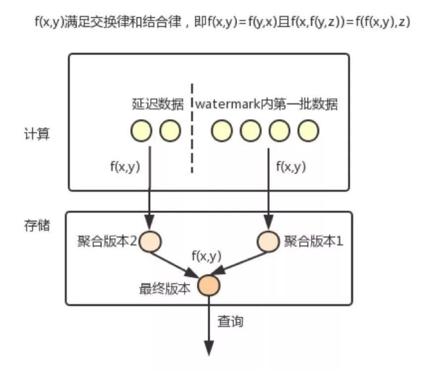 对于满足交换率和结合率的算子,如常见的统计方法(MAX/MIN/SUM/COUNT),在存储侧支持相同运算的情况下,可以将两次运算合并成一次。我们内部称这个方案为多版本,即数据生产一部分就汇聚一部分,每次汇聚产生一个数据版本,由存储在写入时合并,或者在查询时合并。本质上,这是将汇聚的功能迁移了一部分至存储。