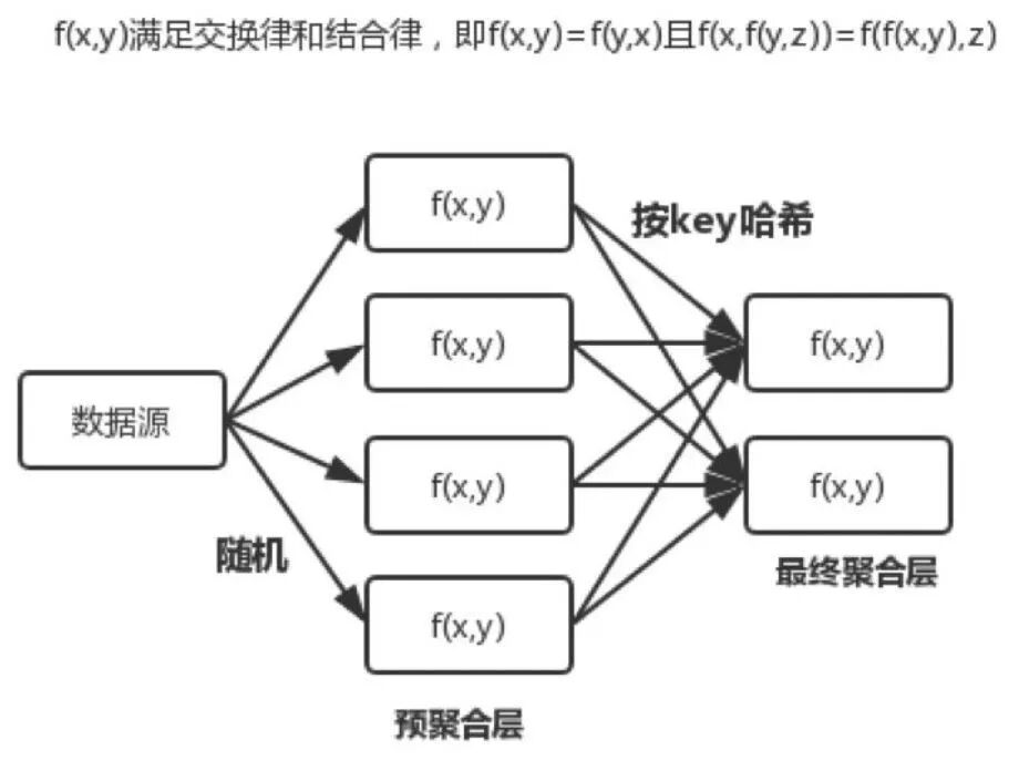 • 对于满足交换率和结合率的计算方法,如MAX/MIN/SUM/COUNT等,可以添加多层预聚合,降低最终聚合的数据量。预聚合层次间可以随机方式,最终汇聚之前按Key哈希。
