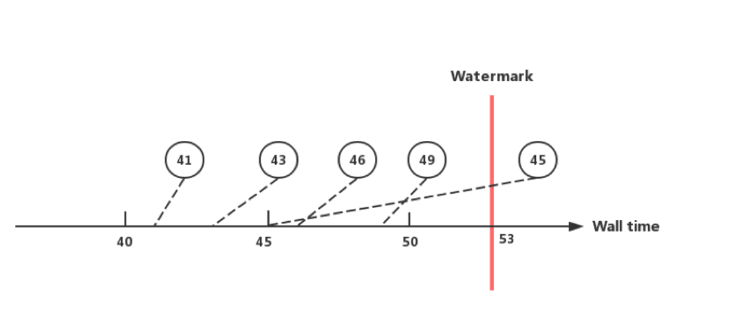 假设我们要统计10s内到达的事件数目,以事件时间(Event Time,即事件携带的时间,多为事件产生时间)作为时间基准。如下图所示,横线为Wall Time时间线,单位为s。圆球表示事件,圆球里面的数字为事件时间,其虚线指向产生时间,圆球正对的Wall Time时间线上的点为被计算系统处理的时间(Process Time),两个时间之间的差值为实际延迟。每个事件都或多或少存在延迟,其中数字为45的圆球延迟最大。对于事件时间[40, 50]这个汇聚窗口,假设我们将Watermark线画在53处,则我们认为数据在53之前已经完全到达,已经接收到的那些数据可以参与汇聚,Watermark之后到来的事件则忽略。