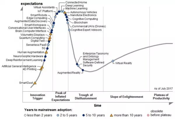 最后一点,数字平台正迅速在流行周期里崛起,这说明了新的IT现实的存在,那就是,平台的提供可以推动未来的发展。量子计算(正在攀爬创新触发点)和Blockchain(已经达到顶峰)技术将在未来五到十年内创造产生出最具变革性和戏剧性的影响。